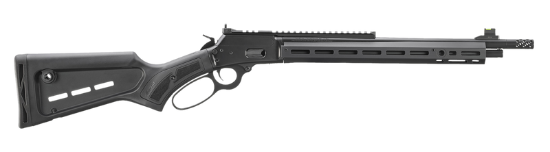 The Marlin 1894 Dark Series is a lever-action rifle chambered in .357 Magnum/.38 Special with a 16.17" threaded barrel and 8-round capacity. It features a nylon-reinforced polymer stock with M-LOK attachment slots, fiber optic front sight with tritium ring, adjustable ghost ring rear sight, and a picatinny rail with integrated cheek riser for optic mounting. This mid-size lever rifle weighs 6.4 lbs with an overall length of 34.63" and includes a radial muzzle brake.