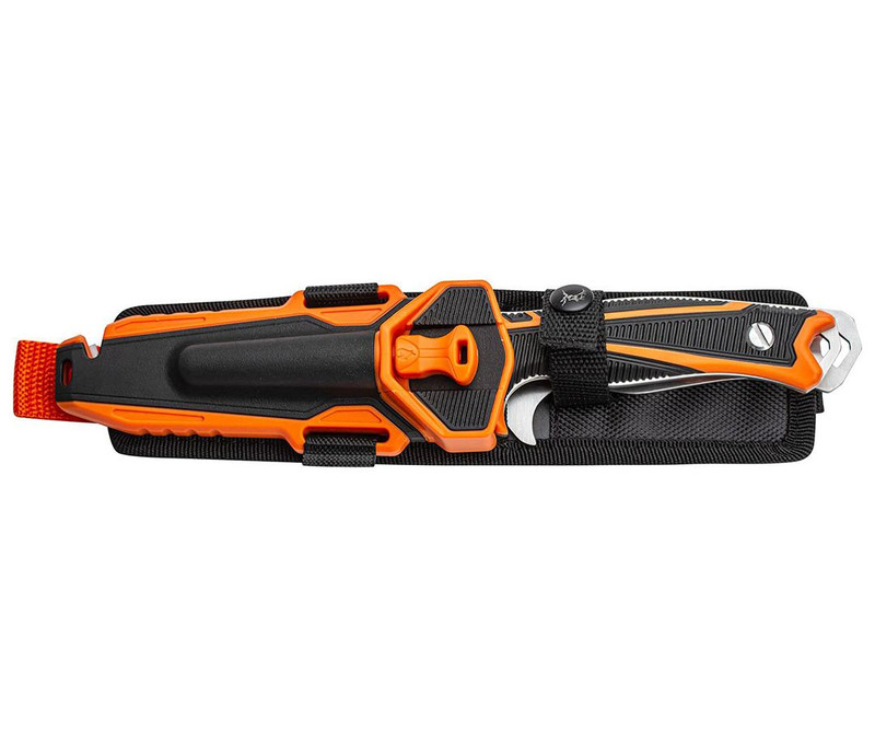 Fixed blade knife featuring a 4.5" drop point blade made from 8Cr13MoV stainless steel with a plain edge. The knife has an injection molded nylon fiber handle in orange and black, weighs 19 oz, and comes with a nylon sheath, making it suitable for hunting and outdoor field use.