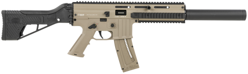 Semi-auto rimfire rifle chambered in .22 LR with a 16.5" barrel and 22+1 round capacity. Features a steel receiver with bronze finish, flip-up front and rear sights, side-folding stock with adjustable cheekrest, manual thumb safety, and faux suppressor. Overall length is 34.5"-36.06", weighing 6.45 lbs.