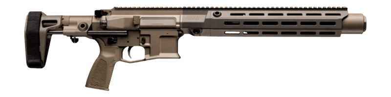 Semi-automatic AR pistol chambered in 300 Blackout with an 8.5" threaded barrel and 30-round capacity. Features a Maxim Pistol Brace, ALG trigger, Arid Cerakote finish, and includes an integrated RFLX suppressor. Polymer grips and semi-automatic action.