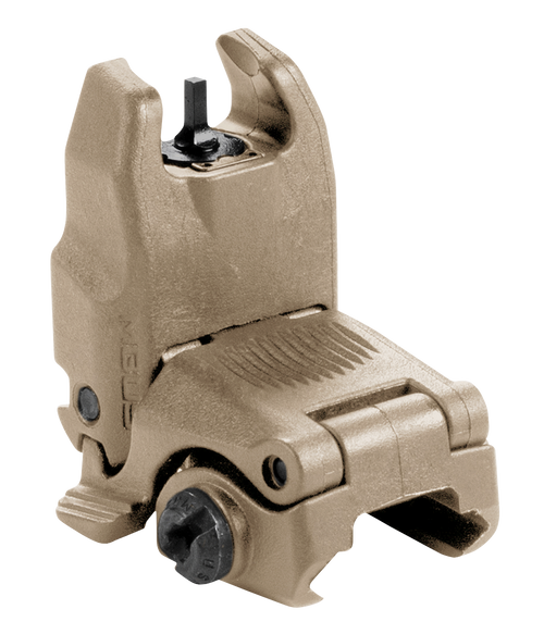 The MBUS Front Sight is a low-cost, color injection molded folding back-up sight designed for AR-15/M16 platforms and Picatinny rails. It features elevation adjustment (1.60 MOA/1.20 MOA) and is constructed from polymer for a lightweight design. The sight includes an adjustment tool and is optimized for use on AR platform handguards.