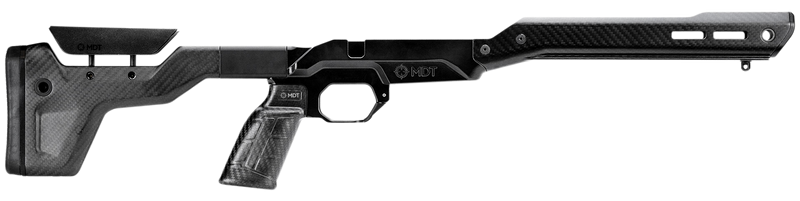 This MDT HNT26 is a precision rifle chassis designed for Remington 700 short action right-hand applications with fixed length of pull. Features an ARCA rail interface, AR-style grip, and free-floating barrel design for improved accuracy. The chassis measures 35.7" in length with adjustable components and comes with ARCA compatibility for mounting accessories.