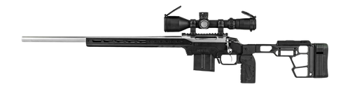 MDT LSS Gen3 rifle chassis designed for right-hand Ruger American short action rifles. This aluminum chassis system provides a modular platform for precision shooting with improved ergonomics and adjustability. Dimensions are approximately 35" length x 10" width x 3" height.