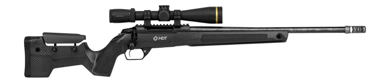 MDT chassis system designed as a complete hunter kit for Tikka TX3 rifles, featuring a carbon fiber finish. This chassis provides a modular platform that replaces the factory stock, offering improved ergonomics and accessory compatibility for hunting applications.
