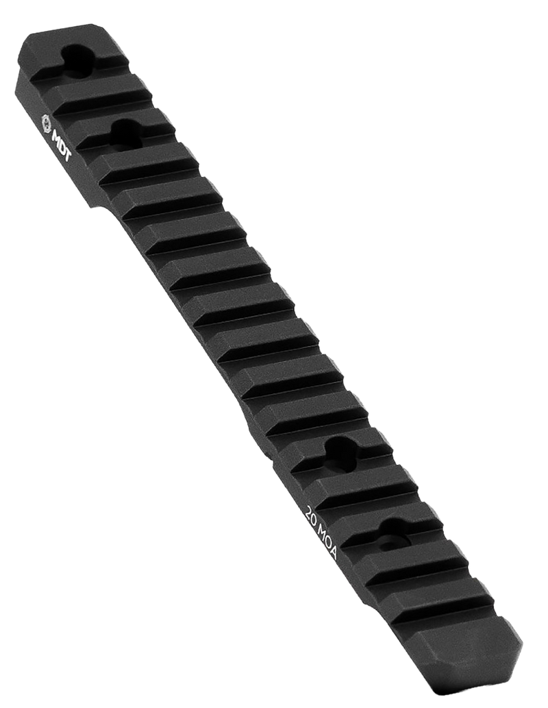 This MDT Picatinny scope rail is a black anodized aluminum accessory designed specifically for Remington 700 short action rifles. The 11" rail features a 20 MOA inclination and mounts directly to the receiver for precision scope mounting. Made from durable aluminum construction, it provides a solid platform for long-range shooting applications.