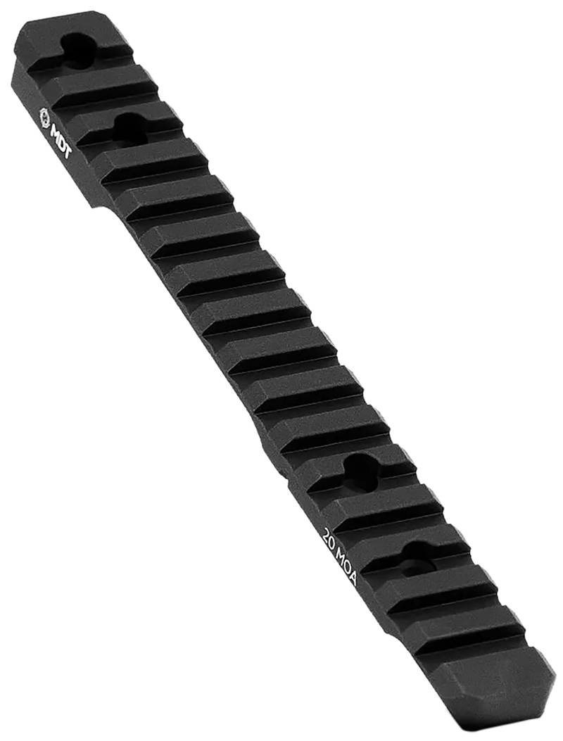 This MDT scope base features a 20 MOA angle designed for long-range shooting applications and fits Howa 1500 long action rifles. Constructed from black anodized aluminum, the base measures 11" in length and provides a Picatinny rail mounting interface for compatible optics.