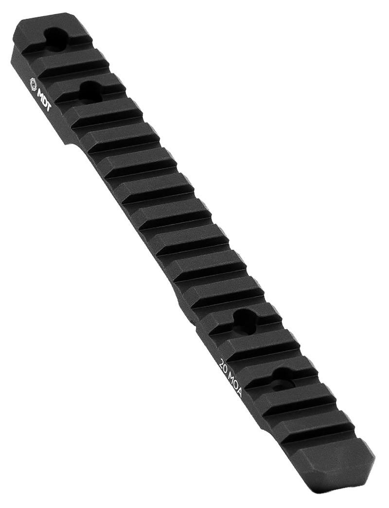 This MDT Picatinny scope rail is an 11-inch aluminum rail with 20 MOA elevation built-in, designed specifically for Tikka T1X rimfire actions. The black anodized finish provides corrosion resistance, and the rail uses standard Picatinny slots for mounting optics and accessories.