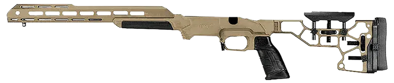 The MDT ESS Chassis is a precision rifle chassis system designed specifically for left-hand shooters using Tikka T3 rifles. This FDE (Flat Dark Earth) finished chassis provides a modern, ergonomic platform with integrated features for tactical and sporting applications. Dimensions are 22.7" length × 9.7" width × 6.8" height.