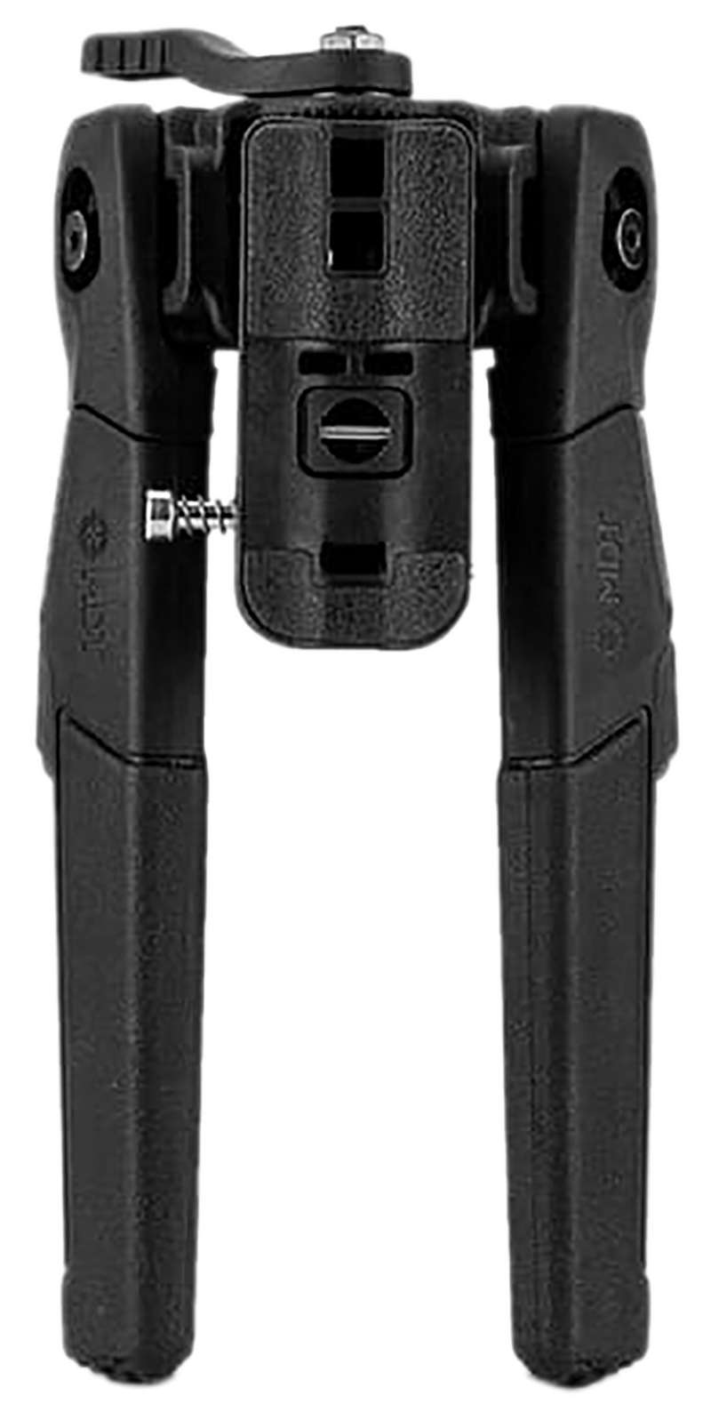 The MDT Oryx Bipod is a height-adjustable bipod with a vertical adjustment range of 7.20-10.40 inches, designed for precision shooting applications. It features premium polymer construction with rubber feet and attaches via sling stud interface. The bipod weighs 12.50 oz and has a matte black finish for durability and corrosion resistance.