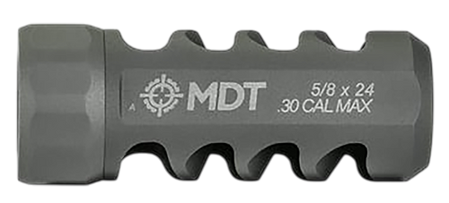 The MDT Hunt Brake is a titanium muzzle brake designed for magnum calibers (.338 and larger) with a 5/8"x24 thread pattern. It features a bead-blasted titanium finish and weighs 1.7 oz, providing recoil reduction for hunting and long-range applications. Direct-thread installation onto compatible barrels; dimensions are approximately 3.8" long x 3.6" wide x 1.7" tall.