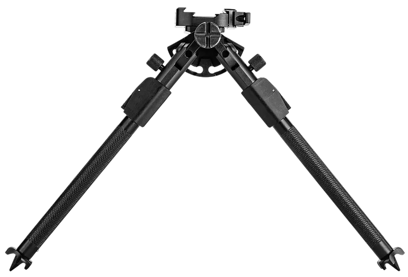 The MDT CKYE-Pod Gen3 is a height-adjustable bipod with legs ranging from 6" to 15", featuring quick-detach ARCA and Picatinny mounting compatibility. It includes spiked feet, single-pull operation, toolless cant tension adjustment up to 360°, and a hard-coat anodized black finish designed for precision shooting and match work.