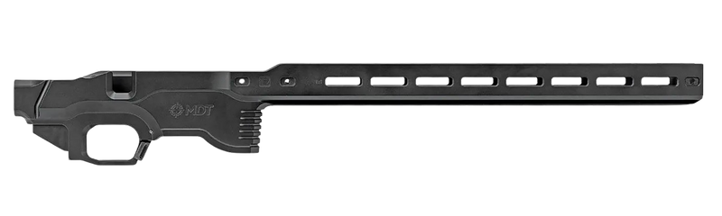 The MDT ACC Premier Gen2 Chassis Base is a precision rifle chassis designed for Ruger American Rimfire rifles in right-hand configuration. Constructed from aluminum with a durable Cerakote black finish, it features dimensions of 30.0" length, 8.2" width, and 2.7" height. This chassis base provides a modular platform for customizing and upgrading your rimfire rifle.