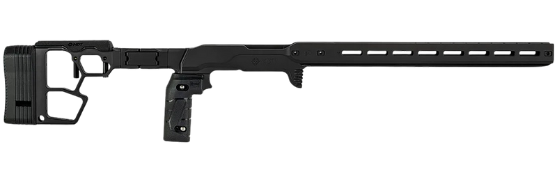 The MDT ACC Premier Gen2 is a precision rifle chassis designed for Ruger American Rimfire platforms, constructed from aluminum with a durable Cerakote black finish. This chassis features adjustable length of pull ranging from 12.50" to 13.50" and measures 31.1" in length, providing a modular platform for customization. Installation is direct-fit to compatible Ruger American Rimfire models with an overall length of 34.40".