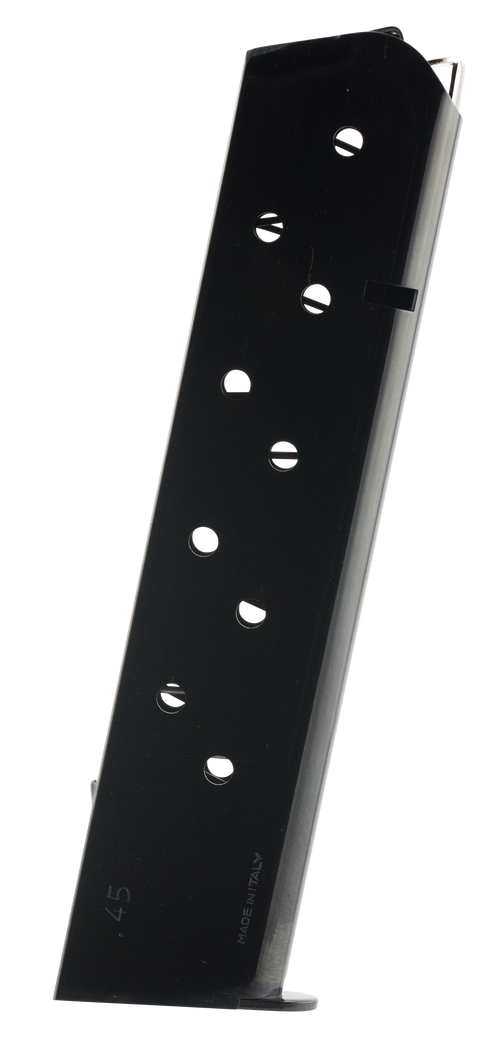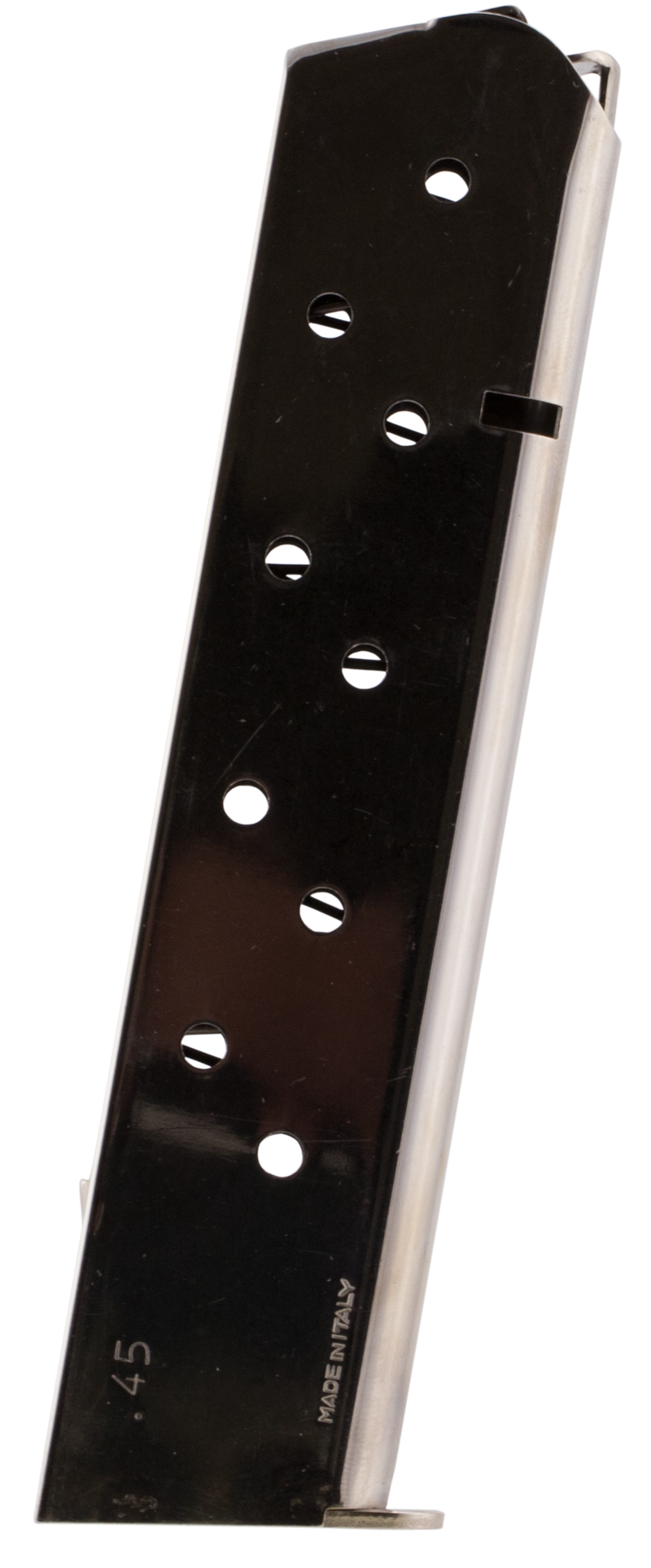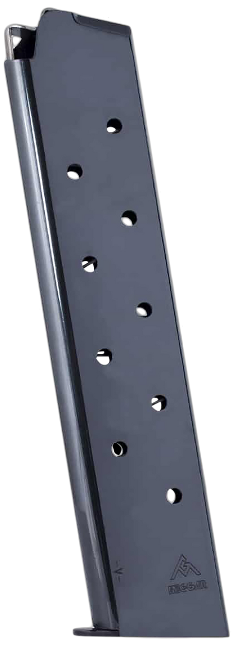 Mec-Gar magazine for Colt 1911 Government pattern firearms chambered in .45 ACP with 10-round extended capacity. Features a carbon steel tube heat-treated for strength, higher tensile music wire spring, steel follower, and welded butt-plate. Finished in nickel for corrosion resistance.