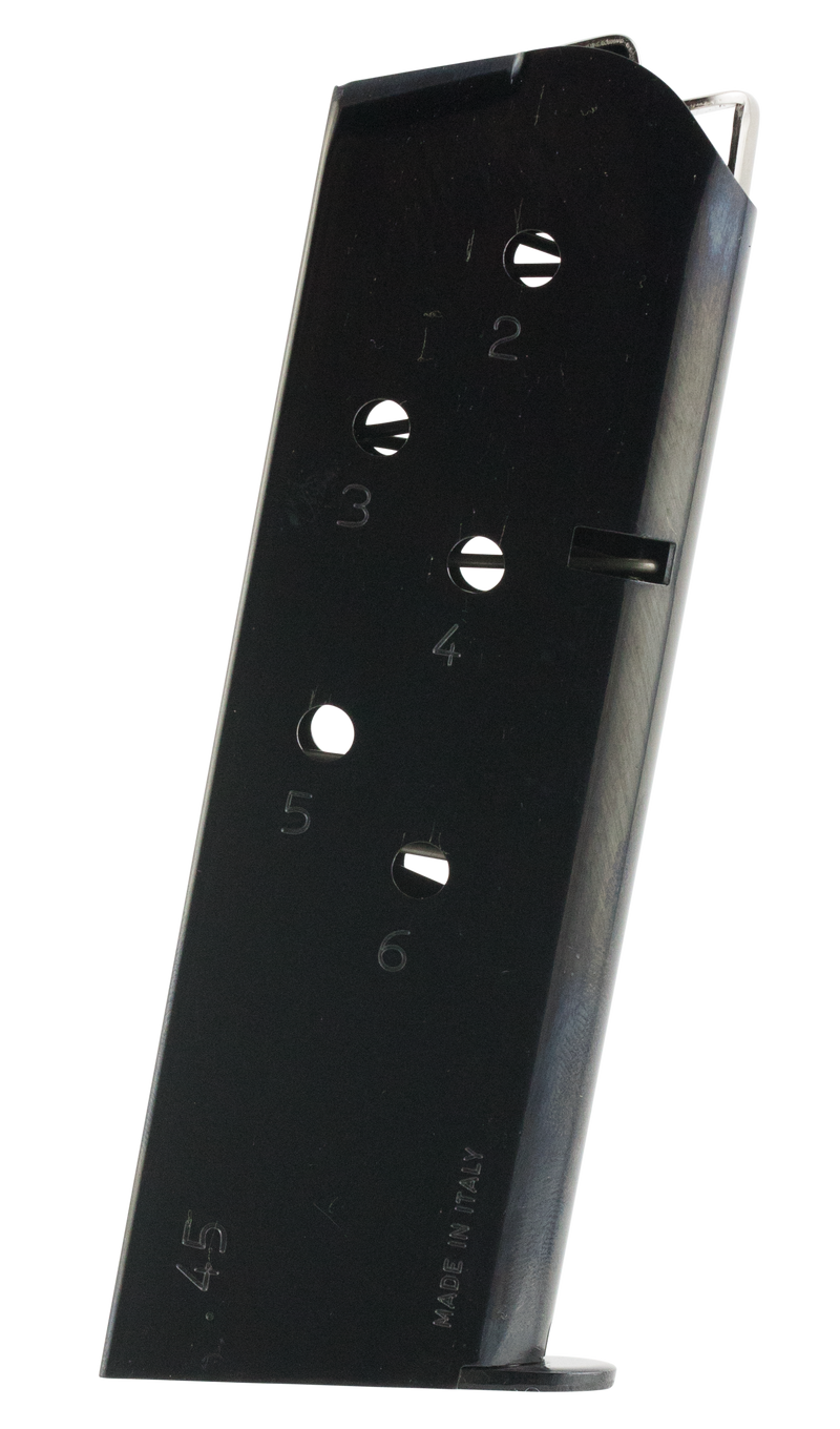 This Mec-Gar magazine is chambered in .45 ACP with a 6-round capacity and fits 1911 Officer/Compact pattern pistols. Features a blued carbon steel tube with heat-treated stamped steel follower, high tensile music wire spring, and a metal floorplate that is welded and flush fit to the pistol.