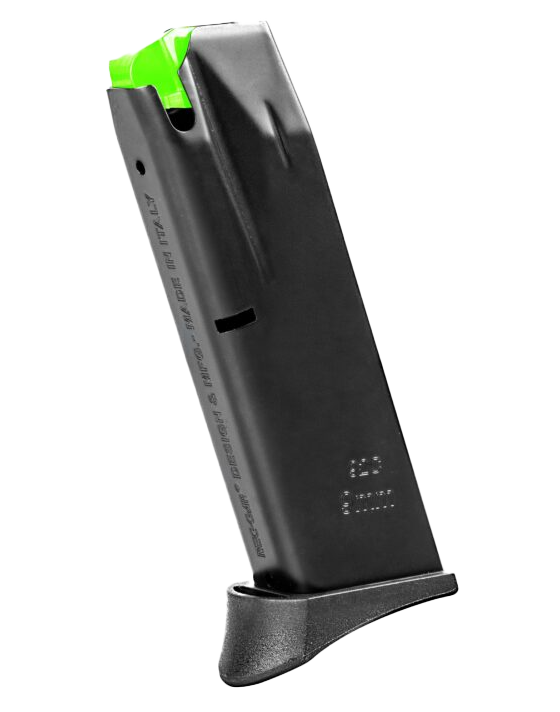 Mec-Gar handgun magazine for Beretta 92 Compact in 9mm Luger with 16-round capacity (+1 round compared to factory magazines) and anti-friction coating for reliable feeding and easy operation. Features heat-treated carbon steel tube, high-tensile music wire spring, and high-visibility green polymer follower with flush-fit finger-rest floorplate.