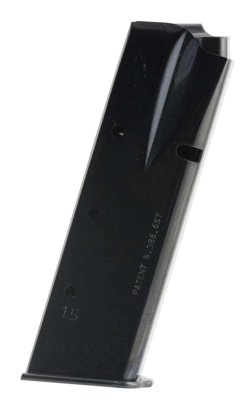Mec-Gar MGBRHP15B is a 15-round detachable handgun magazine chambered in 9mm Luger, designed to fit Browning Hi-Power and Springfield SA-35 pistols. The magazine features a blued carbon steel tube with heat-treated construction, higher tensile music wire spring, polymer follower, and removable steel butt-plate. The flush-fit design utilizes US Patent #5386657 to provide 15-round capacity without increasing standard magazine dimensions.