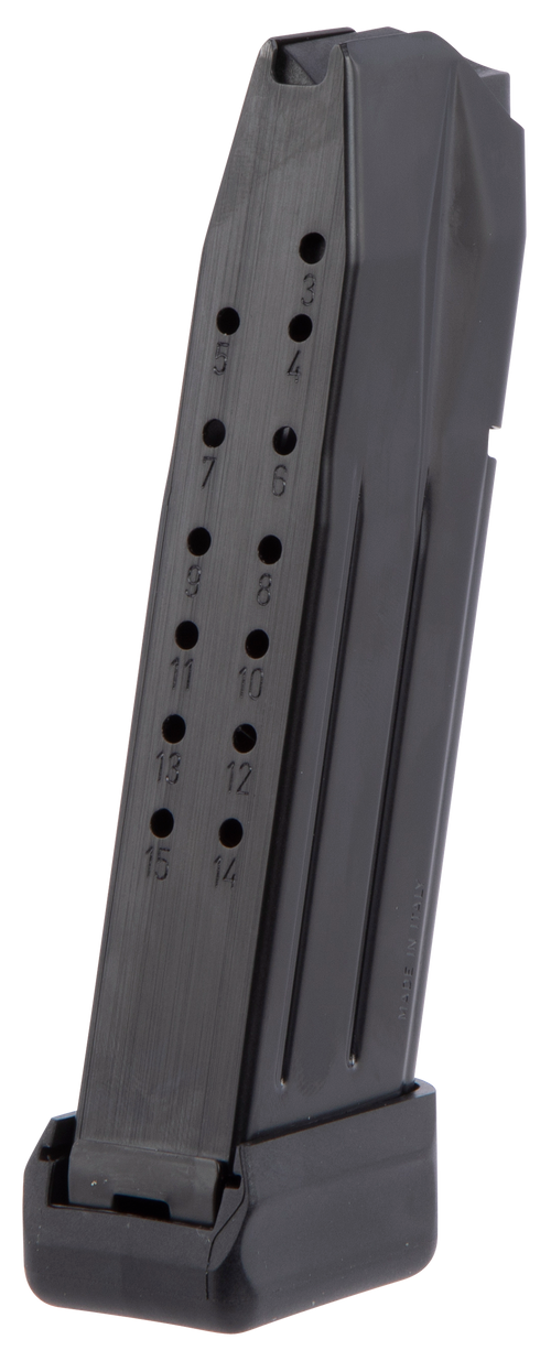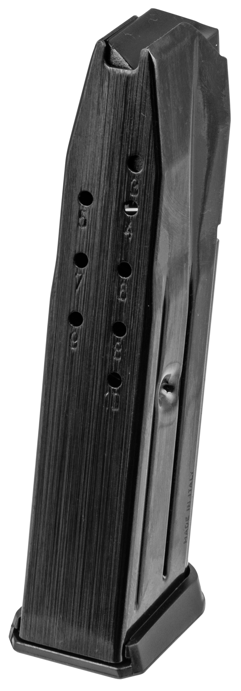 This Mec-Gar handgun magazine is chambered in 9mm Luger with a 10-round capacity and fits Sig Sauer P229 and P229 E2 pistols with the wider tapered P229-1 magazine design. The blued carbon steel tube is heat-treated for strength and features a polymer follower and floorplate with high tensile music wire spring for reliable feeding.