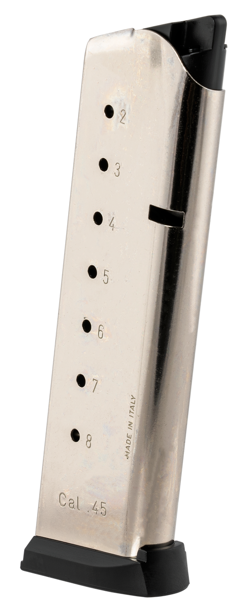 Mec-Gar magazine for 1911 Government pistols chambered in .45 ACP with 8-round capacity. Features carbon steel construction with blued finish and 2nd Amendment text laser-engraved on the body. Heat-treated for strength with lubricated nylon polymer follower and high-tensile music wire spring for reliable feeding and easy disassembly.