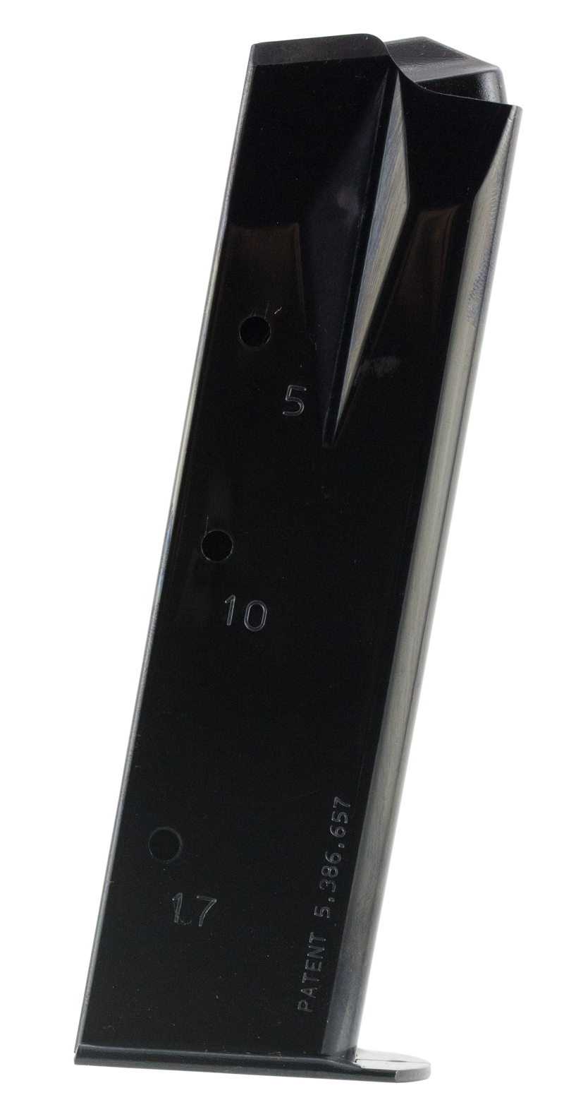 9mm Luger handgun magazine with 17-round capacity designed for Ruger P-series pistols (P85, P89, P93, P94, P95, and PC9). Features a carbon steel tube with heat-treated construction, polymer follower, and removable steel butt-plate in a flush-fit design that maintains standard dimensions while providing two additional rounds via patented technology.
