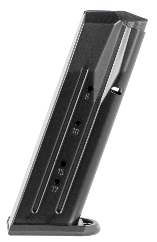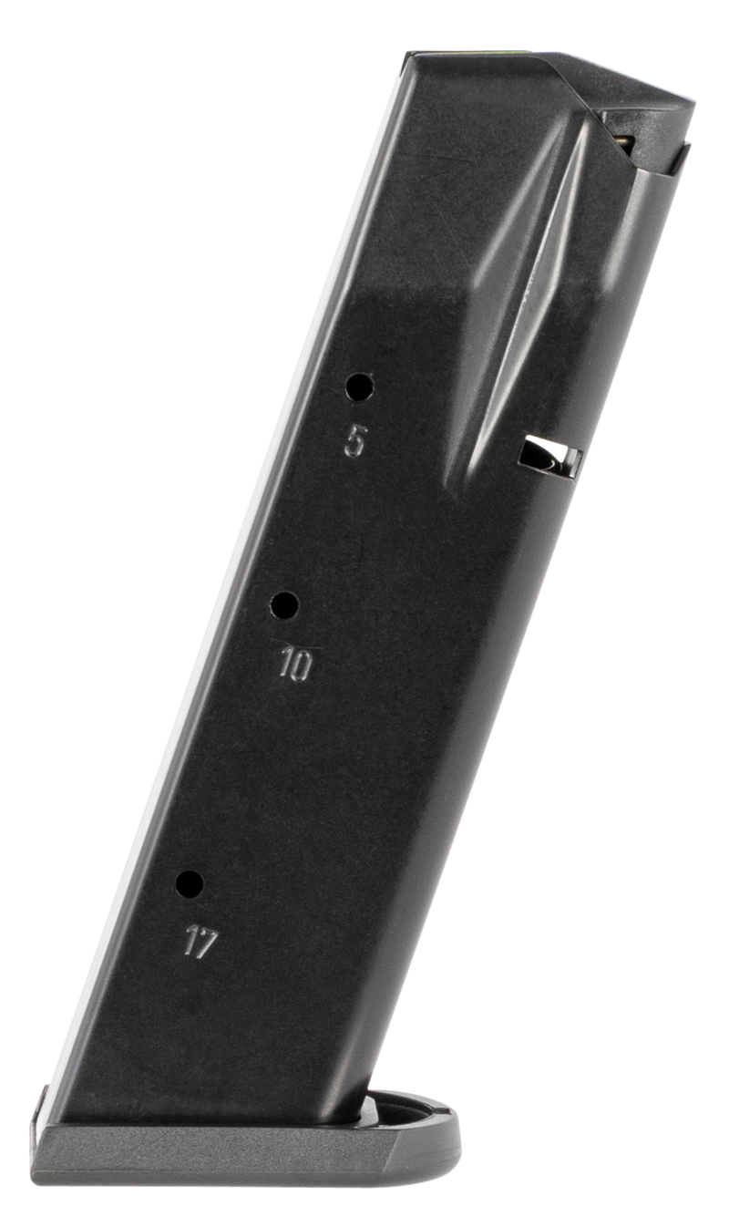 Mec-Gar handgun magazine chambered in 9mm Luger with 17-round capacity (+1 round versus factory magazines while maintaining flush fit) for Tanfoglio Witness Small Frame pistols. Features a heat-treated carbon steel tube with anti-friction coating, high-tensile music wire spring, and high-impact polymer follower and floorplate for reliable feeding and durability.