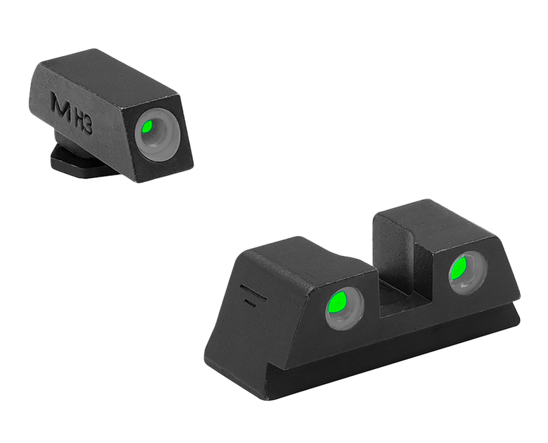 Self-illuminating tritium night sights featuring green front and rear elements with white outlines for enhanced visibility in all lighting conditions. These fixed, snag-free sights require no batteries or maintenance and mount directly to Glock 42, 43, 43X, 48, and 48X models without weapon modifications. The sights provide integrated day and night sighting capability and have demonstrated an 85% increase in hit accuracy in marksman testing.