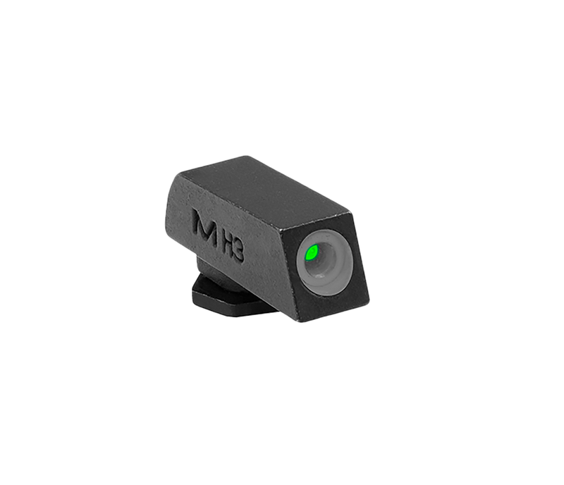Self-illuminated tritium night sight front for Glock pistols, featuring a green tritium element with white outline for rapid target acquisition in low-light conditions. Fixed steel construction fits Glock Gen 1-5 models in 9mm, .40 S&W, .357 SIG, and .45 GAP. Test results show over 85% increase in hit efficiency compared to standard sights.