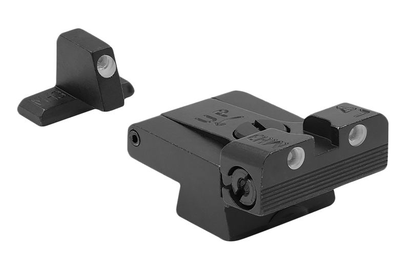 This is a front and rear night sight set designed for HK USP pistols, featuring green tritium elements in a black steel frame for low-light targeting. Both front and rear sights are adjustable for windage and elevation, allowing shooters to customize their point of aim. The Tru-Dot design provides reliable illumination in darkness without requiring batteries.