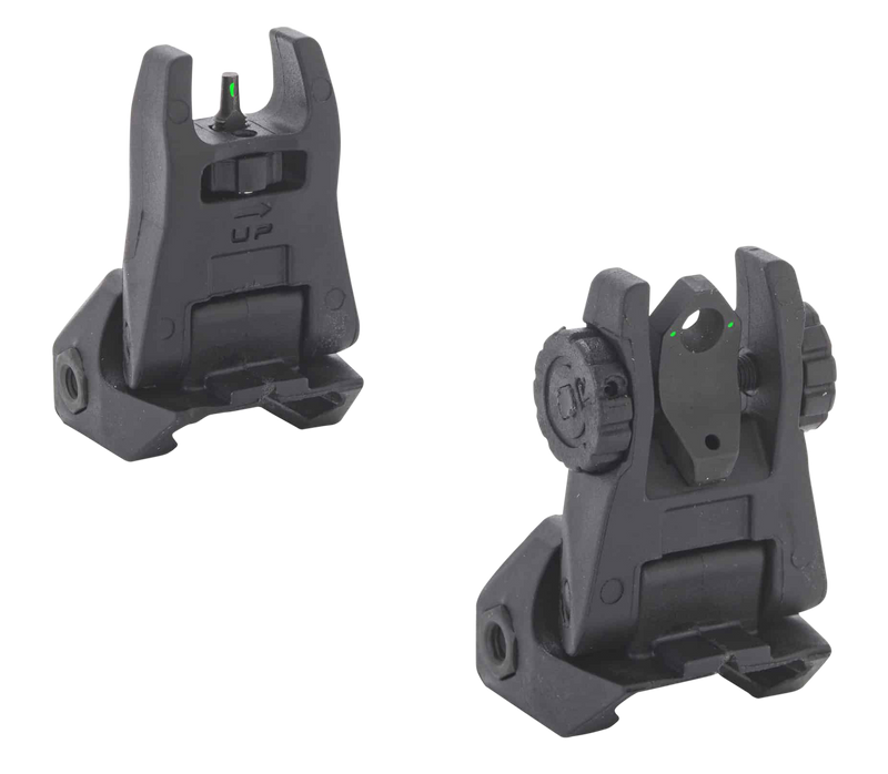 Flip-up backup sight set for AR-15 and AR Platform firearms featuring green tritium illumination in both front and rear positions for low-light shooting. Polymer and metal construction with 43 MOA windage and 26 MOA elevation adjustment range. Mounts directly to Picatinny rail systems with a 2-dot rear and 1-dot front configuration.