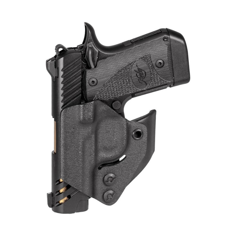 This Mission First Tactical Minimalist Holster is a low-profile Inside the Waistband (IWB) design compatible with the Kimber Micro 9, suitable for appendix and 5 o'clock carry positions. The ambidextrous holster features an audible click with side retention and includes a claw for right-handed shooters to minimize printing, with a removable claw and spacer for left-handed configuration. The matte black finish provides a durable, discreet carry option.