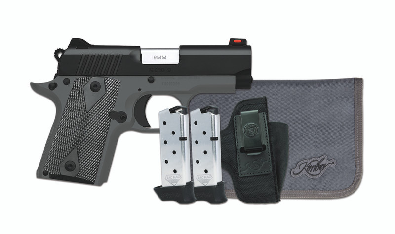 The Kimber Micro 9 RTC is a compact 1911-style semi-automatic pistol chambered in 9mm with a 3.15" ramped barrel and 7+1 round capacity. It features a KimPro II Black stainless steel slide with flared and lowered ejection port, white dot fixed sights, and grey aluminum frame grips. This bundle includes two 7-round magazines and a DeSantis Pro Seal holster.