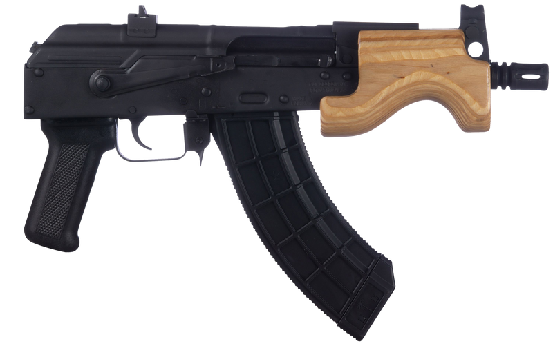 The Century Arms Micro Draco is a semi-automatic AK-style pistol chambered in 7.62x39mm with a 6.25" threaded barrel (M14x1 LH threads) and stamped steel receiver. It features a polymer grip, lever safety, adjustable sights, and accepts all standard AK magazines, including the included 30rd magazine. Overall length is 14.5" and weighs 4.85 lbs.