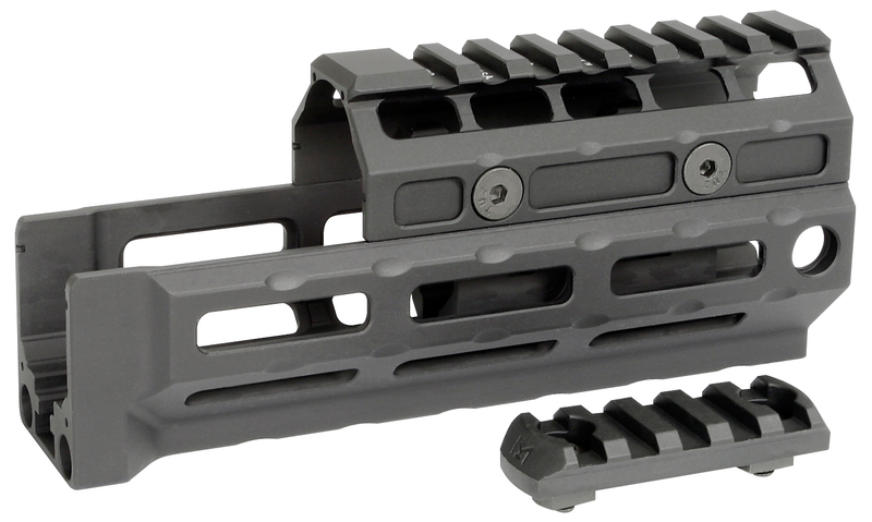 This is a lightweight aluminum M-LOK compatible handguard designed for AK-Platform rifles. The Gen 2 features a patented clamping system for tool-free installation without permanent modifications, and includes one five-slot Picatinny rail section plus two anti-rotation QD sockets.