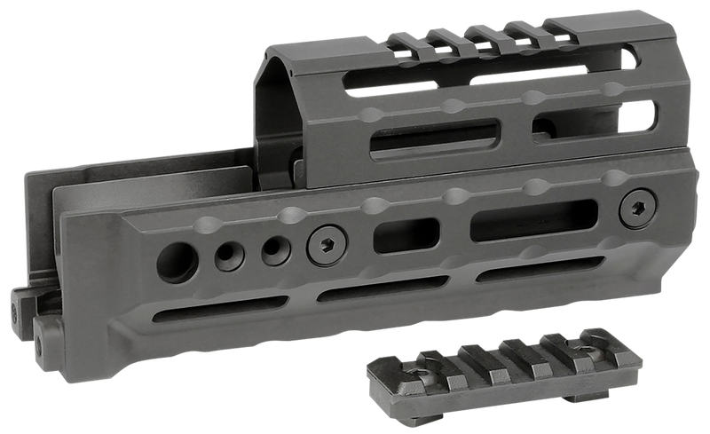 Drop-in aluminum handguard designed for AK-47/AK-74 platform rifles with stamped receivers. Features M-LOK compatibility, black hardcoat anodized finish, includes heat shield, and requires no permanent modifications to the firearm. 6 inches long with robust design and multiple quick-detach sling attachment points.
