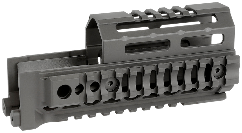 Drop-in handguard for AK-47/AK-74 and AKM platforms with stamped receivers, constructed from 6061 aluminum with a black anodized finish. Features an adjustable design with integrated heat shield, multiple Picatinny rail sections for accessory mounting, and QD attachment points; installs without permanent modifications to the firearm.