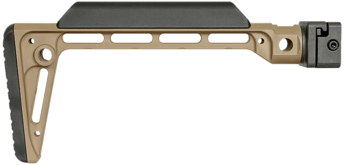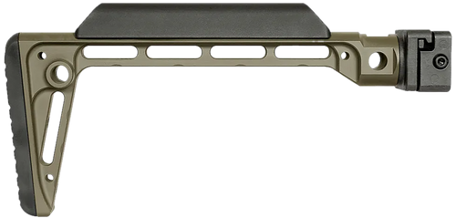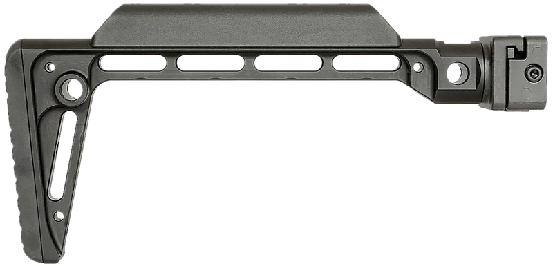 This is a minimalistic side-folding rifle stock constructed from hard coat anodized 6061 aluminum with a heavy-duty 4140 heat-treated steel folding mechanism. It features a full-length locking lug for maximum strength, solid positive lock-up in both positions, and can be configured for right or left folding. The stock includes 5 QD sling attachment points, a polymer cheek piece, and rubber butt pad for comfort, and is compatible with Picatinny rail systems.