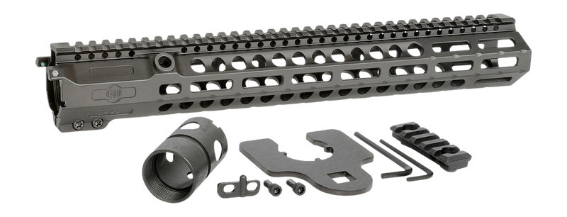 This is a 15-inch M-LOK compatible handguard designed for AR-10 and .308 platforms. Constructed from 6061 T6 hardcoat anodized aluminum with machined heavy-duty anti-rotation tabs and a longer 4140 barrel nut for maximum stability. Features include two steel anti-rotation QD sockets, a patented torque plate to prevent forward movement, and a low-profile combat rail design optimized for minimal point of impact shift with mounted optics and aiming devices.