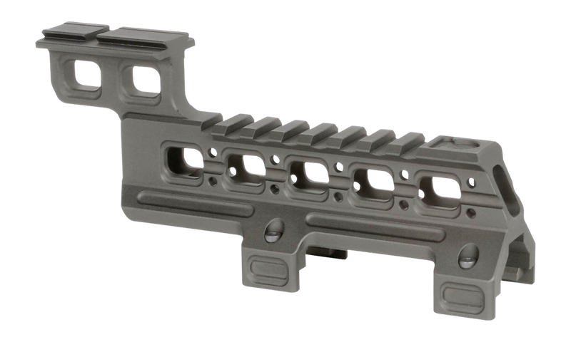 This is a scope mount designed for MP5/MP5K rifles to accommodate Acro-pattern optics and night vision equipment. The mount provides a secure, repeatable interface for mounting compatible red dot sights and thermal imaging systems.
