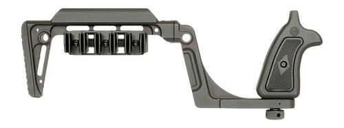 The Bounty Hunter is a patent-pending stock designed exclusively for Smith & Wesson X Frame revolvers, featuring a hardcoat anodized black finish. It provides additional points of contact, increased stability, enhanced comfort, and simplified takedown for storage and transport, reimagining the revolver as a more adaptable and customizable platform.