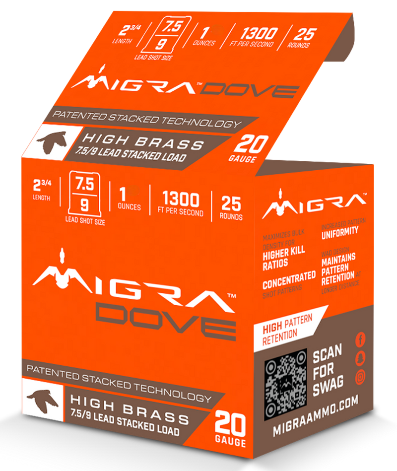 Migra Field Lite shotshells in 20 gauge, 2 3/4" with 1oz of #7.5 and #9 lead shot, designed specifically for dove hunting and upland game birds. High brass plastic casing with velocities between 1300-1350 fps provides reliable performance for hunters seeking consistent shot placement.