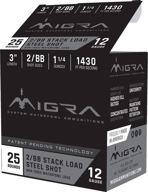 Migra Steel Waterfowl Stacked Shotshells deliver premium steel shot in a 12 gauge 3.5" magnum load with a muzzle velocity of 1425 fps, featuring an innovative combination load of #2 and #BB shot designed for waterfowl hunting. These small-batch manufactured shells contain no fillers and are engineered for consistent patterns and improved performance. Each box contains 25 rounds of high brass plastic-cased ammunition.