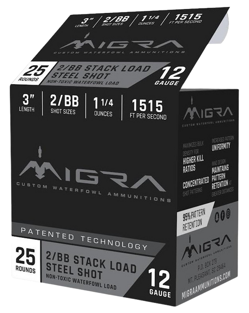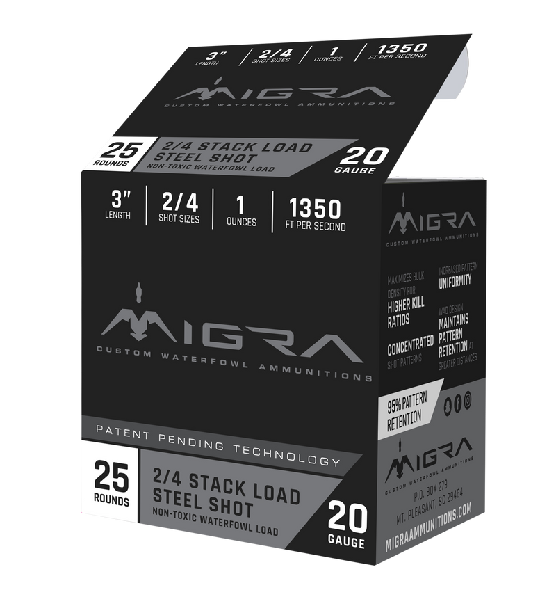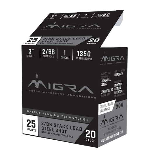 Migra Combinational Load 20 gauge shotshell designed for waterfowl and multiple hunting situations. Features 1 oz of #2 and #4 shot combination in a 3" plastic case with a muzzle velocity of 1350 fps, delivering uniform patterns and consistent performance without fillers.