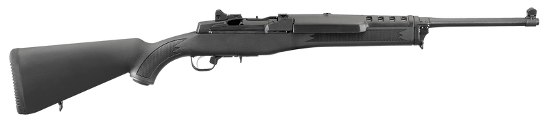 The Ruger Mini-14 Ranch is a semi-automatic rifle chambered in 5.56 NATO/.223 Remington with an 18.5" cold hammer-forged barrel and 5+1 capacity. It features a blued alloy steel receiver with integral scope mounts, adjustable rear and blade front sights, and a fixed black synthetic stock. Weighing 6.75 lbs with an overall length of 37.5", it includes two 5-round magazines and a Picatinny rail with scope rings.
