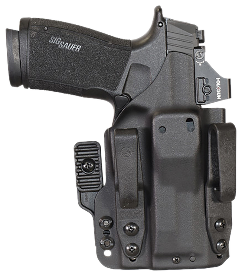 Inside waistband holster designed for the Sig Sauer P365 X-Macro, constructed from Kydex material for durability and retention. Ambidextrous design accommodates both left and right-hand carry, and includes two tuckable 1" belt clips plus one standard 1" belt clip for versatile carry options.