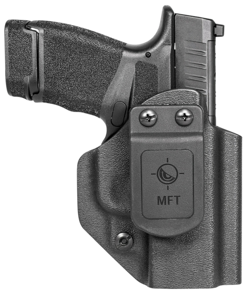 Outside-the-waistband (OWB) holster designed specifically for the Glock 42 in right-hand configuration. Constructed by Mission First Tactical, a manufacturer known for duty-grade holster solutions. This black holster provides secure retention and accessible carry for compact pistols.