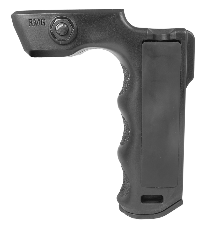 The React Magwell Grip (RMG) is a compact vertical foregrip designed for magwell mounting on AR-15, M4, M16, and HK 416 platforms. Constructed of textured polymer, it measures 7.3" in length with 1.4" width and height, providing positive grip purchase for wet or gloved hands in CQB situations. Features include right and left-handed pressure pad wells for wired switches, a battery storage compartment, and positioning that locates the support hand forward of the magazine well.