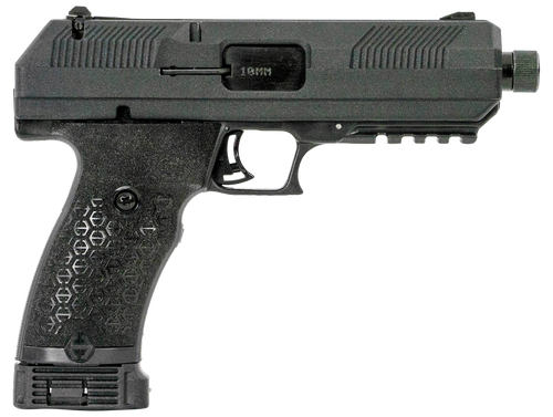 The Hi-Point JHP Gen2 is a .45 ACP striker-fired semi-auto pistol with a 5.25" threaded barrel and 9+1 capacity. Features a polymer frame with M81 US Woodland Camo finish, 3-dot adjustable rear sights, magazine disconnect safety, and is rated for +P ammunition. This 44.8 oz. pistol has an overall length of 8.5" and includes one 9-round magazine.
