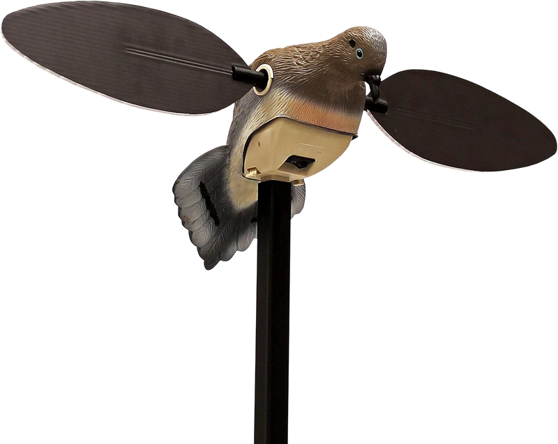 Motorized spinning wing dove decoy featuring a revolutionary patent-pending design that separates the motor housing from a flexible PVC decoy body for realistic movement. Operates on AA batteries and uses motion-activated wing spinning to attract doves. Dimensions are 13.4" L x 7.3" W x 4.8" H.