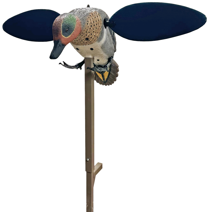 This motion duck decoy features super-fast wing movement designed to attract waterfowl, particularly green winged teal and other duck species. It operates on AA batteries and includes motorized motion for enhanced realism in the field. The decoy measures 12.3" in length and represents an upgraded version of Mojo's original green wing teal model.