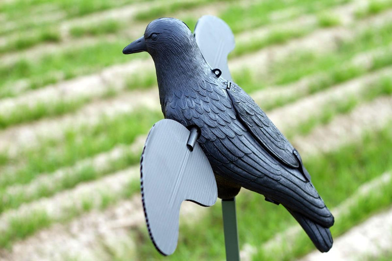 This motion decoy features a dual shaft direct drive motor system with magnetic wings that quickly attach to the motor shaft. It includes a built-in 1.5 seconds on/off cycler that mimics fighting or feeding behavior to attract other crows. The spinning wing design and automatic timing make it effective for crow hunting without complex setup.